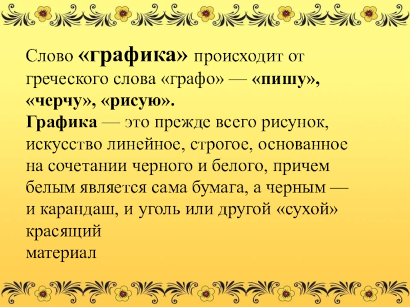 Слово «графика» происходит от греческого слова «графо» — «пишу», «черчу», «рисую».Графика — это прежде всего рисунок, искусство