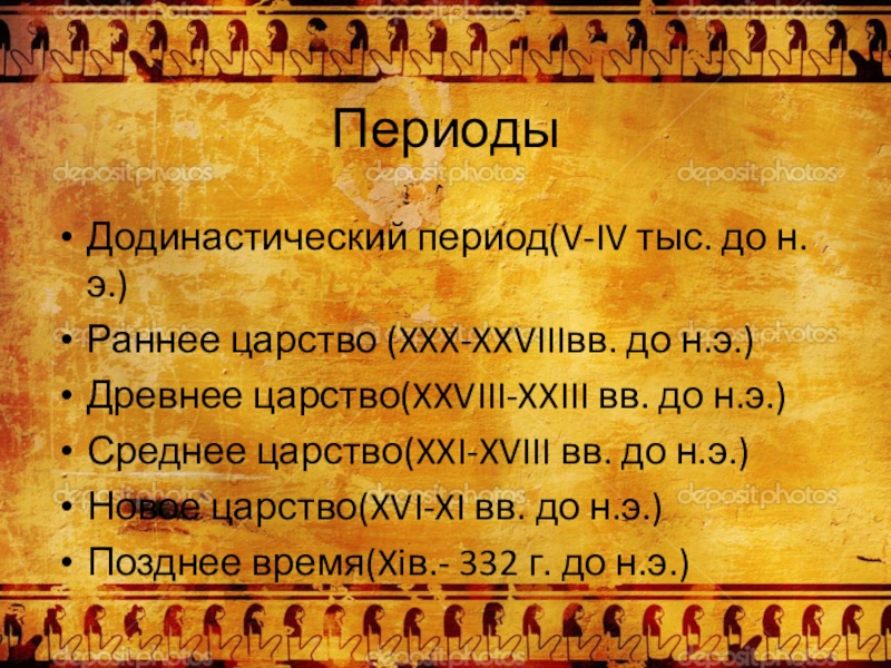Периоды Додинастический период(V-IV тыс. до н.э.)Раннее царство (XXX-XXVIIIвв. до н.э.)Древнее царство(XXVIII-XXIII вв. до н.э.)Среднее царство(XXI-XVIII вв. до