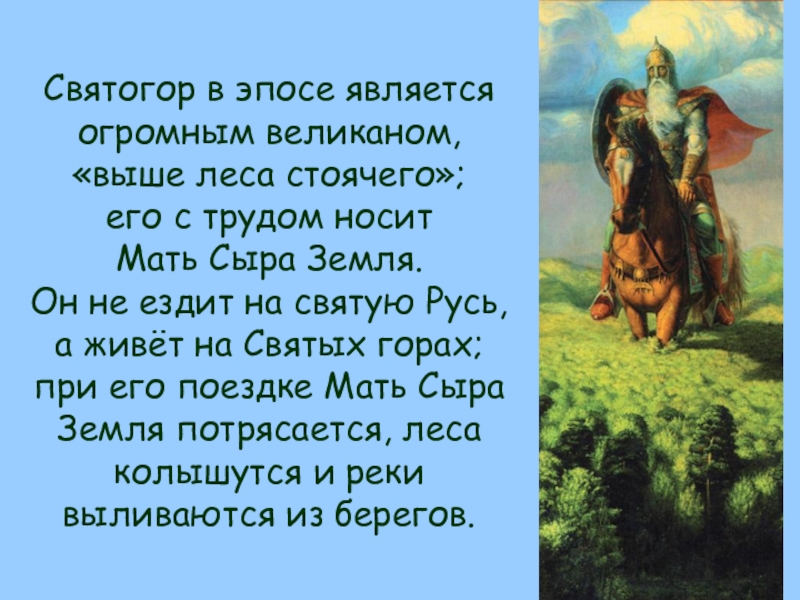 Слайд 4Святогор в эпосе является огромным великаном, «выше леса стоячего»; его с