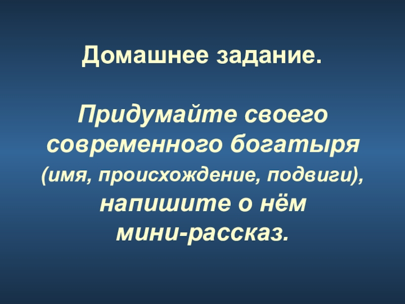 Домашнее задание.   Придумайте своего современного богатыря (имя, происхождение, подвиги),  напишите о нём  мини-рассказ.