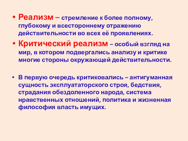 Реализм – стремление к более полному, глубокому и всестороннему отражению действительности во всех её проявлениях.Критический реализм – особый взгляд на мир, в котором подвергались анализу и критике многие стороны окружающей действительности.В первую очередь критиковались – антигуманная