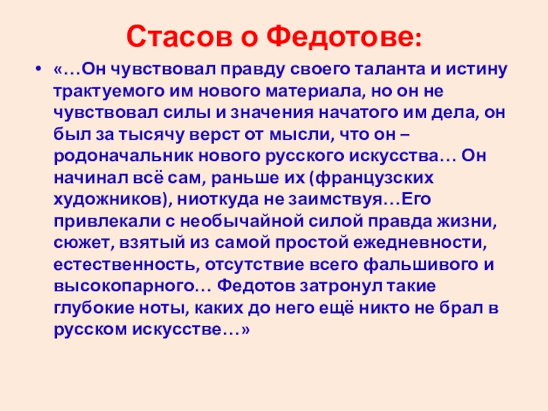 Стасов о Федотове:«…Он чувствовал правду своего таланта и истину трактуемого им нового материала, но он не чувствовал