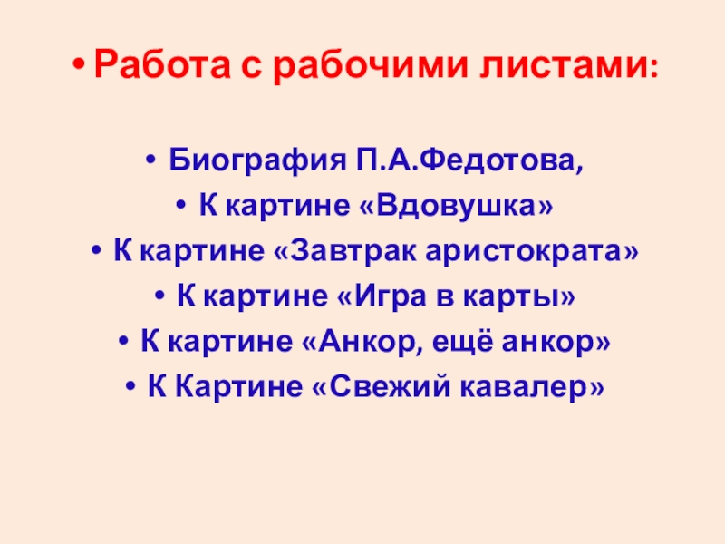 Работа с рабочими листами:Биография П.А.Федотова,К картине «Вдовушка»К картине «Завтрак аристократа»К картине «Игра в карты»К картине «Анкор, ещё