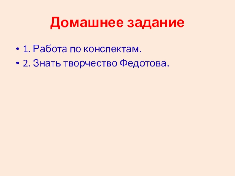 Домашнее задание1. Работа по конспектам.2. Знать творчество Федотова.