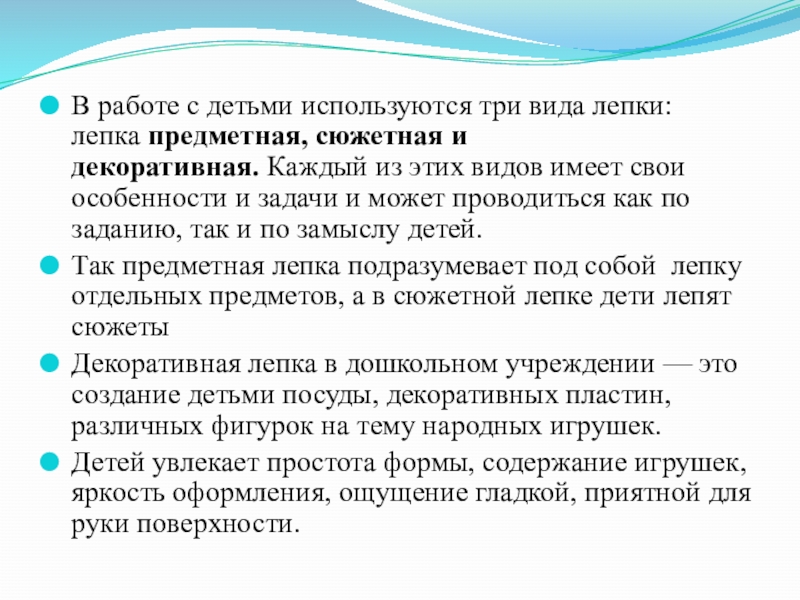 Слайд 15В работе с детьми используются три вида лепки: лепка предметная, сюжетная и