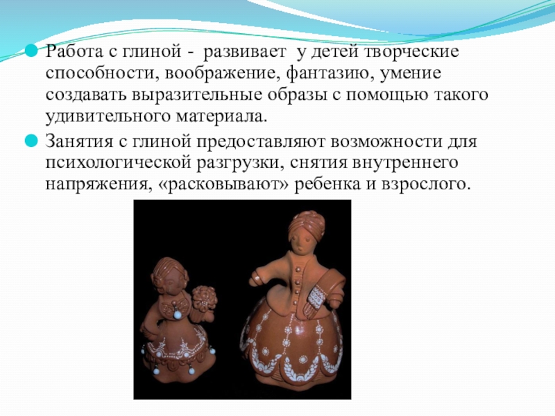 Слайд 16Работа с глиной - развивает у детей творческие способности, воображение, фантазию,