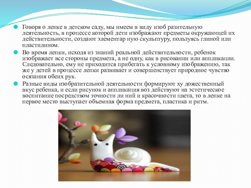 Во время лепки, исходя из знаний реальной действительности, ребенок изображает все стороны предмета, а не одну, как в рисовании или аппликации. Следовательно, ему не приходится прибегать к условному изображению, так же у детей в процессе лепки развивает и совершенствует природное чувство осязания обеих рук.