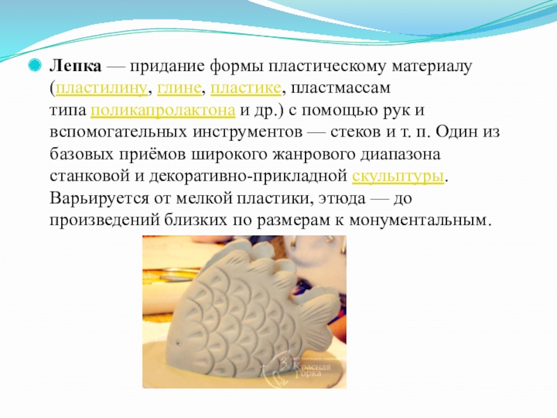Слайд 2Лепка — придание формы пластическому материалу (пластилину, глине, пластике, пластмассам типа поликапролактона и др.) с помощью