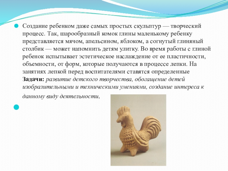 комок глины маленькому ребенку представляется мячом, апельсином, яблоком, а согнутый глиняный столбик — может напомнить детям улитку. Во время работы с глиной ребенок испытывает эстетическое наслаждение от ее пластичности, объемности, от форм, которые получаются в процессе лепки. На занятиях лепкой перед воспитателями ставятся определенные Задачи: развитие детского творчества, обогащение детей изобразительными и техническими умениями, создание интереса к данному виду деятельности.