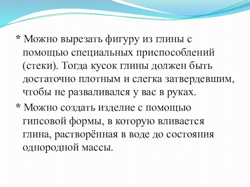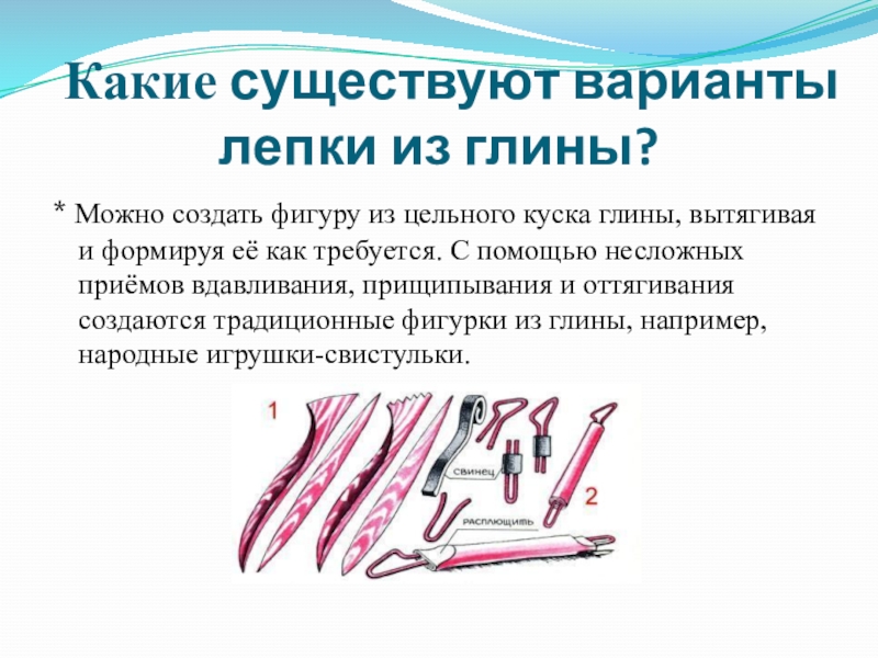Слайд 5* Можно вырезать фигуру из глины с помощью специальных приспособлений (стеки). Тогда