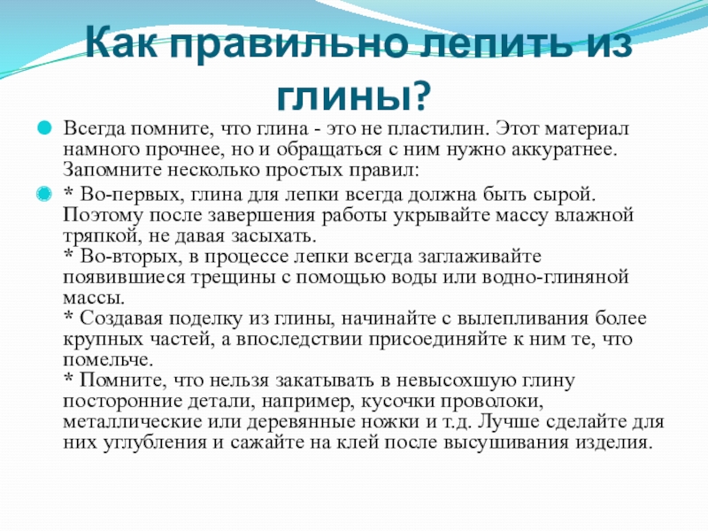 * Создавая поделку из глины, начинайте с вылепливания более крупных частей, а впоследствии присоединяйте к ним те, что помельче.