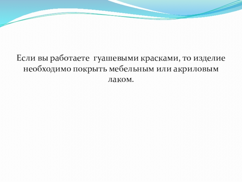 Слайд 15Если вы работаете гуашевыми красками, то изделие необходимо покрыть мебельным или