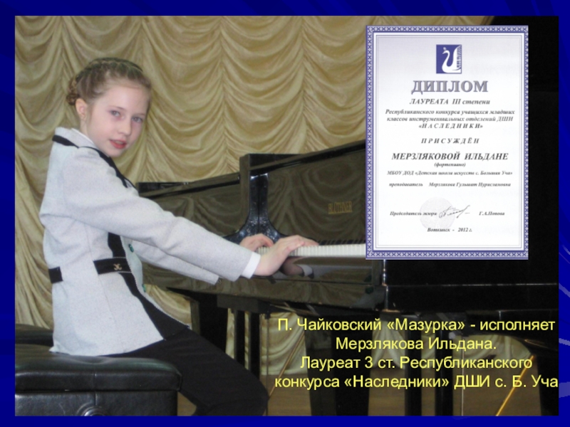 П. Чайковский «Мазурка» - исполняет Мерзлякова Ильдана.Лауреат 3 ст. Республиканского конкурса «Наследники» ДШИ с. Б. Уча