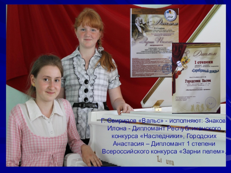 Слайд 3Г. Свиридов «Вальс» - исполняют: Знакова Илона - Дипломант Республиканского