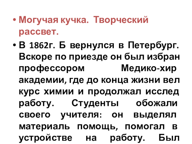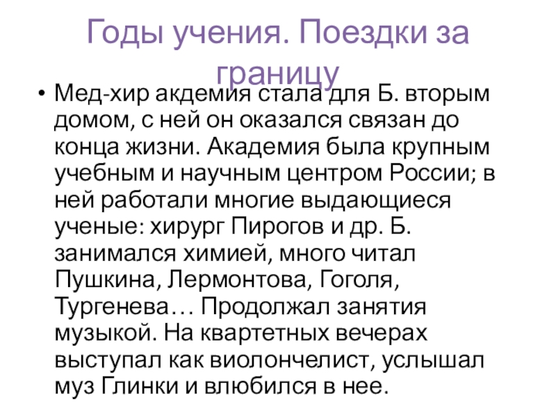 с ней он оказался связан до конца жизни. Академия была крупным учебным и научным центром России; в ней работали многие выдающиеся ученые: хирург Пирогов и др. Б. занимался химией, много читал Пушкина, Лермонтова, Гоголя, Тургенева… Продолжал занятия музыкой. На квартетных вечерах выступал как виолончелист, услышал муз Глинки и влюбился в нее.