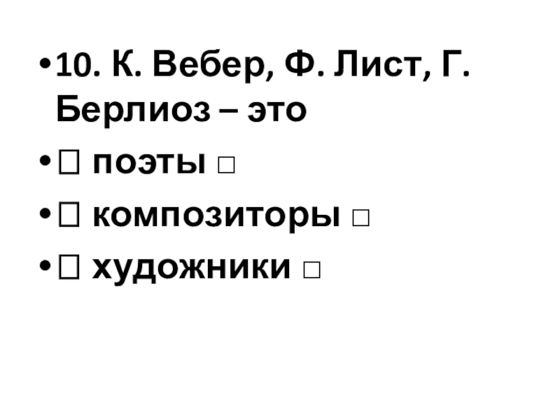 Слайд 2710. К. Вебер, Ф. Лист, Г. Берлиоз – это