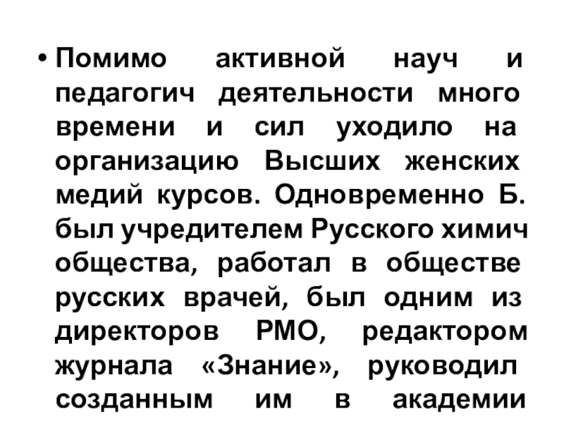 на организацию Высших женских медий курсов. Одновременно Б. был учредителем Русского химич общества, работал в обществе русских врачей, был одним из директоров РМО, редактором журнала «Знание», руководил созданным им в академии студенческим хором и оркестром.