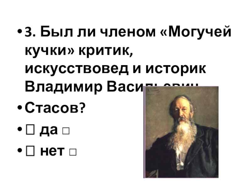 Слайд 203. Был ли членом «Могучей кучки» критик, искусствовед и историк Владимир