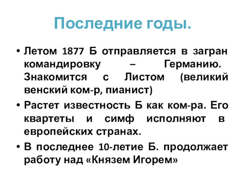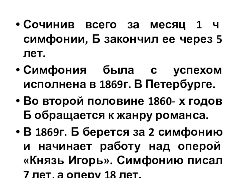 В 1869г. Б берется за 2 симфонию и начинает работу над оперой «Князь Игорь». Симфонию писал 7 лет, а оперу 18 лет.