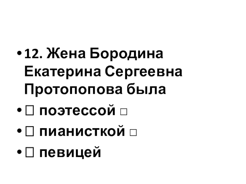 Слайд 2912. Жена Бородина Екатерина Сергеевна Протопопова была
