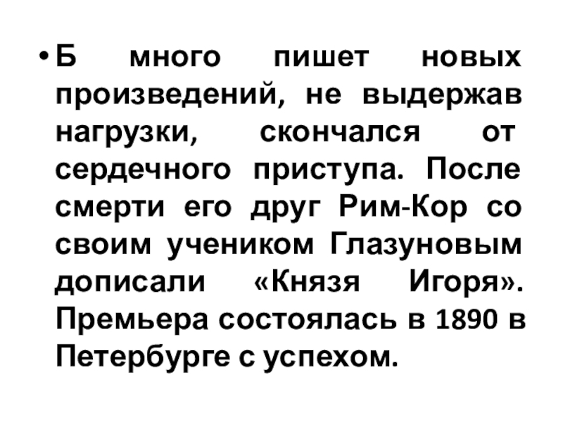 Слайд 16Б много пишет новых произведений, не выдержав нагрузки, скончался от сердечного