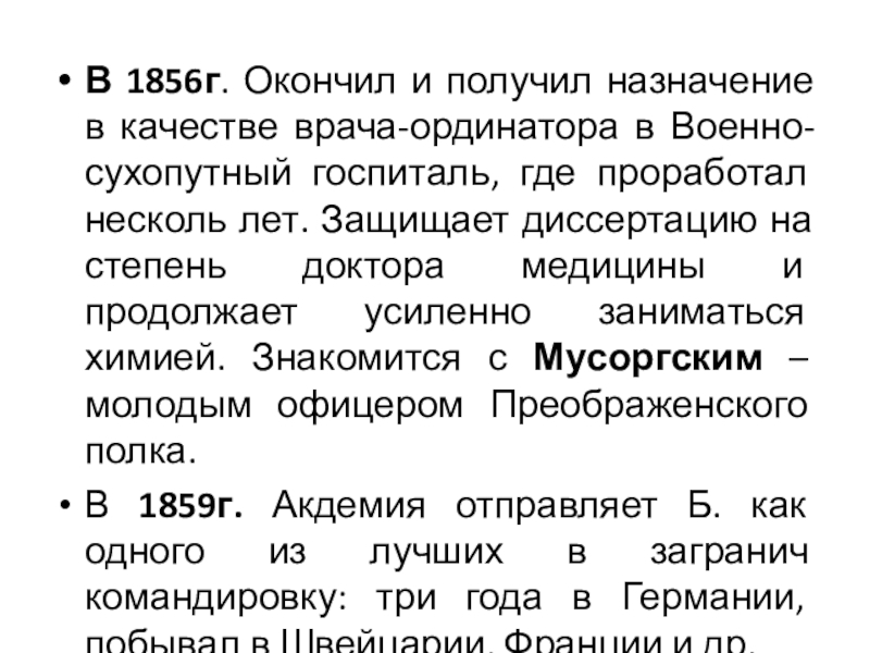 госпиталь, где проработал несколь лет. Защищает диссертацию на степень доктора медицины и продолжает усиленно заниматься химией. Знакомится с Мусоргским – молодым офицером Преображенского полка.