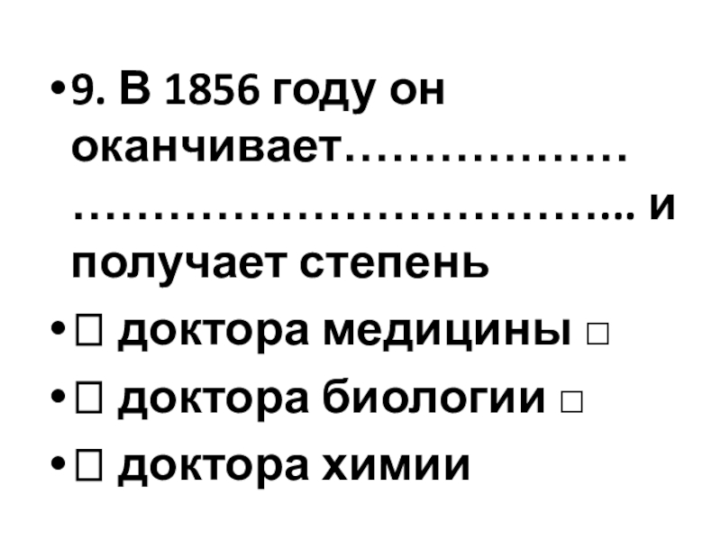 Слайд 269. В 1856 году он оканчивает……………………………………………... и получает степень