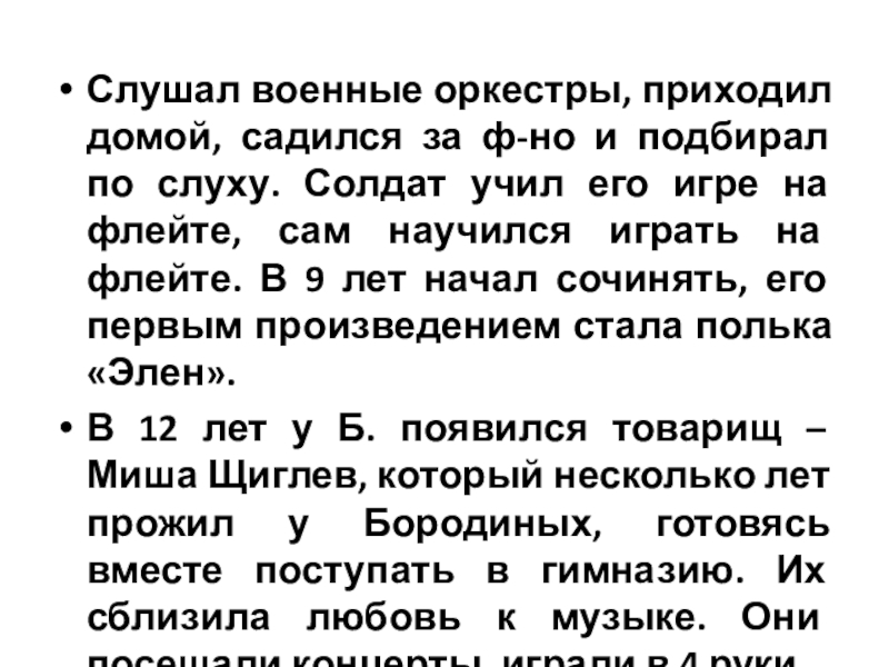 Слайд 5Слушал военные оркестры, приходил домой, садился за ф-но и подбирал по