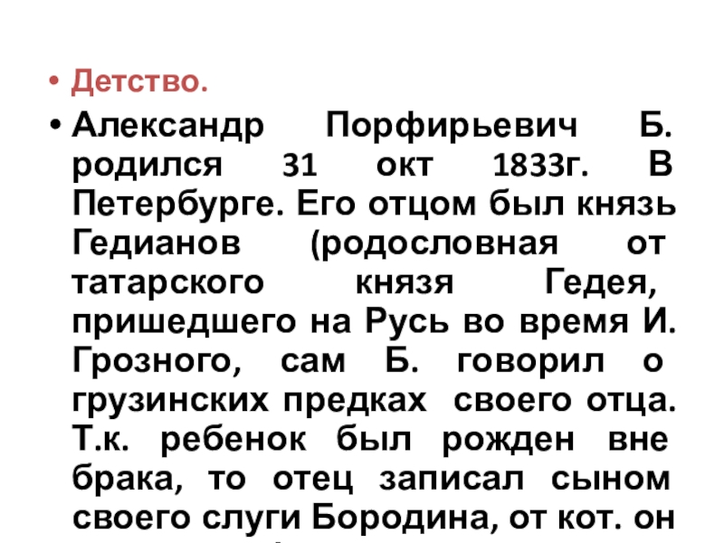 отцом был князь Гедианов (родословная от татарского князя Гедея, пришедшего на Русь во время И. Грозного, сам Б. говорил о грузинских предках своего отца. Т.к. ребенок был рожден вне брака, то отец записал сыном своего слуги Бородина, от кот. он и получил фамилию т отчество) .