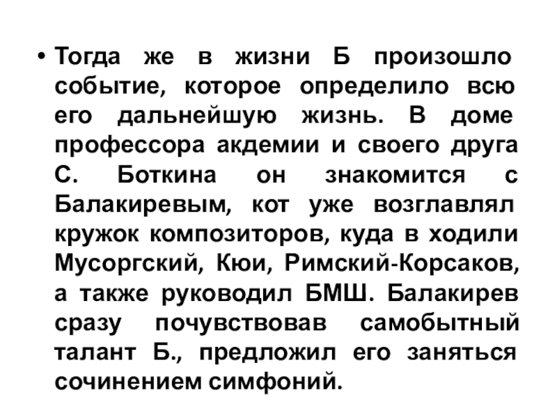 дальнейшую жизнь. В доме профессора акдемии и своего друга С. Боткина он знакомится с Балакиревым, кот уже возглавлял кружок композиторов, куда в ходили Мусоргский, Кюи, Римский-Корсаков, а также руководил БМШ. Балакирев сразу почувствовав самобытный талант Б., предложил его заняться сочинением симфоний.