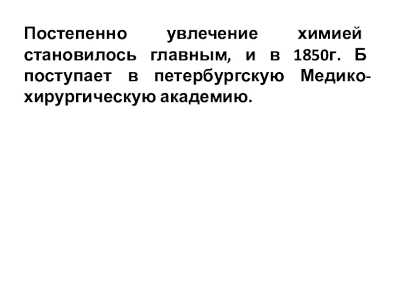 Слайд 6Постепенно увлечение химией становилось главным, и в 1850г. Б поступает в