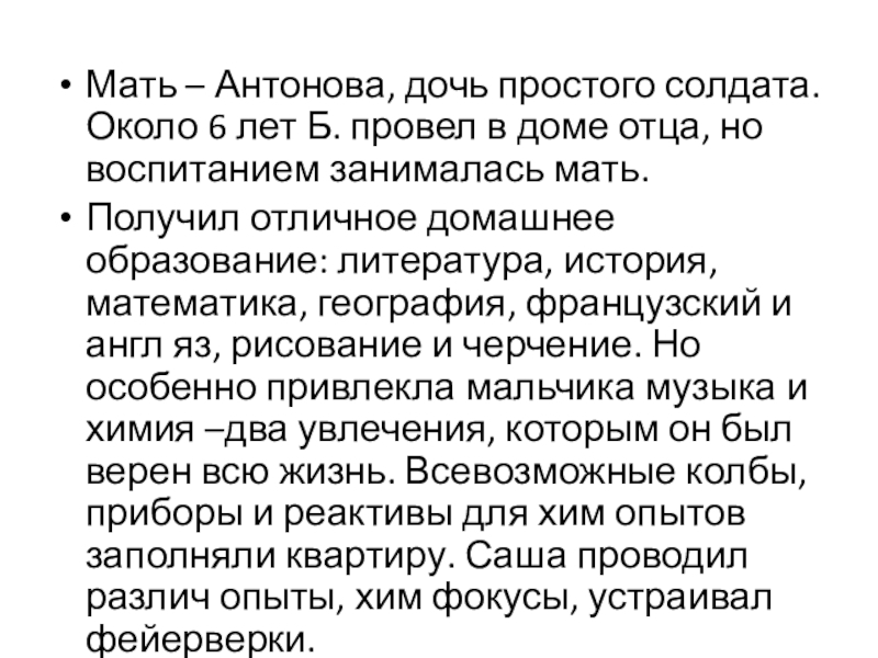 Слайд 4Мать – Антонова, дочь простого солдата. Около 6 лет Б. провел