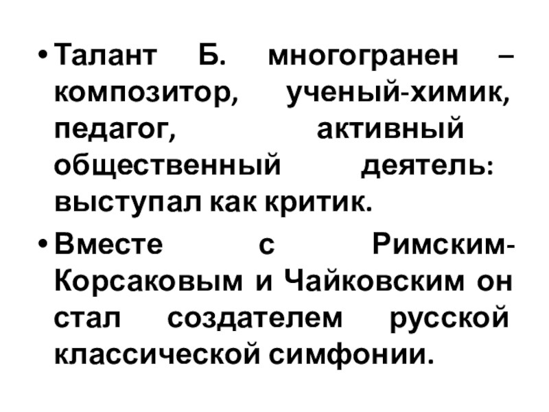 Слайд 2Талант Б. многогранен – композитор, ученый-химик, педагог, активный общественный деятель: выступал