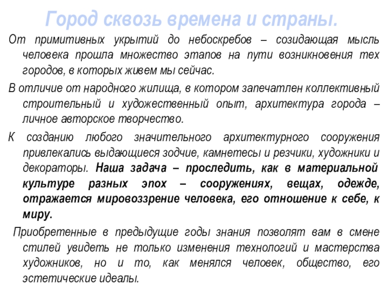 Готика – суровый и изящный стиль. Образ города предстает как мир самых разных построек: соборов, ратуш, цехов и каменных жилых домов. Здание рассматривалось в связи с пространством. Его планировка исходила из уже сложившейся среды и той жизни, которая кипела вокруг.