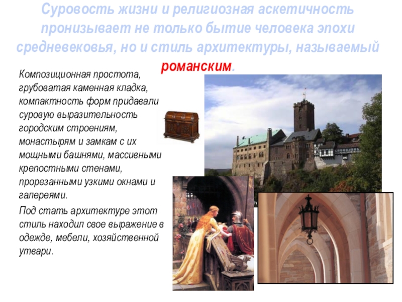 Композиционная простота, грубоватая каменная кладка, компактность форм придавали суровую выразительность городским строениям, монастырям и замкам с их мощными башнями, массивными крепостными стенами, прорезанными узкими окнами и галереями.