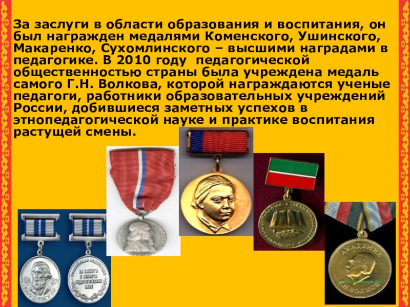 За заслуги в области образования и воспитания, он был награжден медалями Коменского, Ушинского, Макаренко, Сухомлинского – высшими наградами в педагогике. В 2010 году педагогической общественностью страны была учреждена медаль самого Г.Н. Волкова, которой награждаются ученые педагоги, работники образовательных учреждений России, добившиеся заметных успехов в этнопедагогической науке и практике воспитания растущей смены.