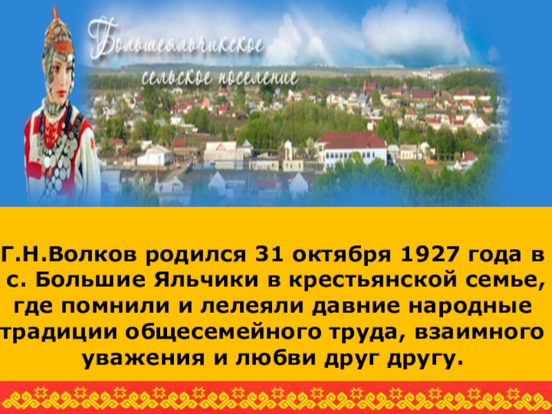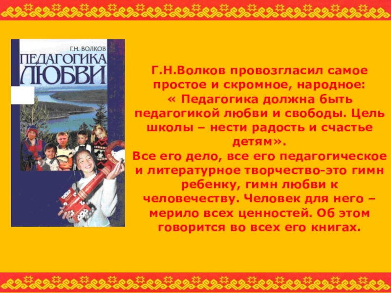 Слайд 7Г.Н.Волков провозгласил самое простое и скромное, народное: