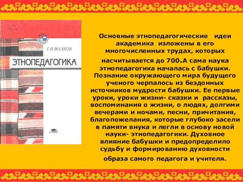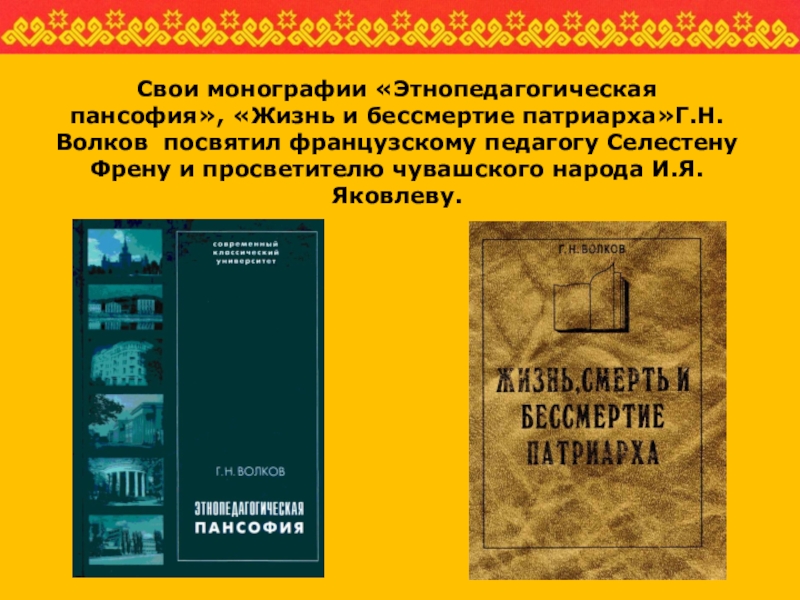Слайд 15Свои монографии «Этнопедагогическая пансофия», «Жизнь и бессмертие патриарха»Г.Н.Волков посвятил французскому педагогу