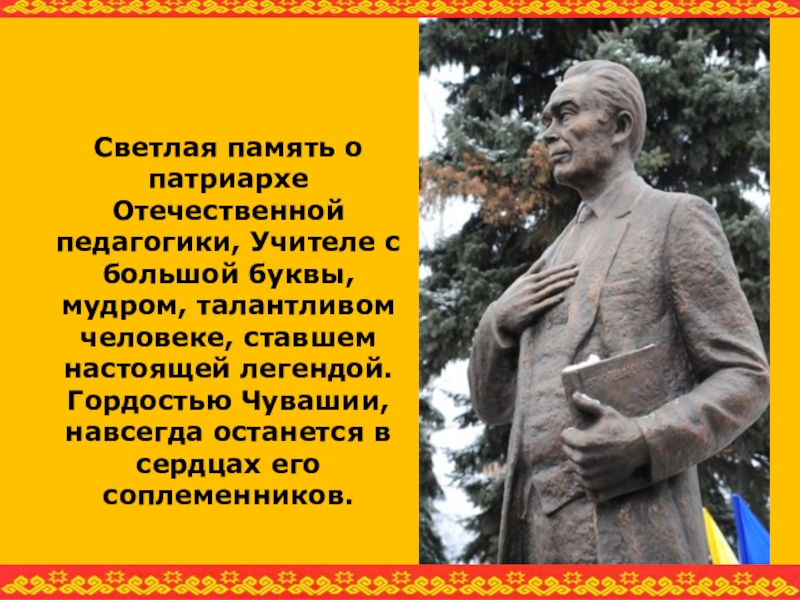талантливом человеке, ставшем настоящей легендой. Гордостью Чувашии, навсегда останется в сердцах его соплеменников.