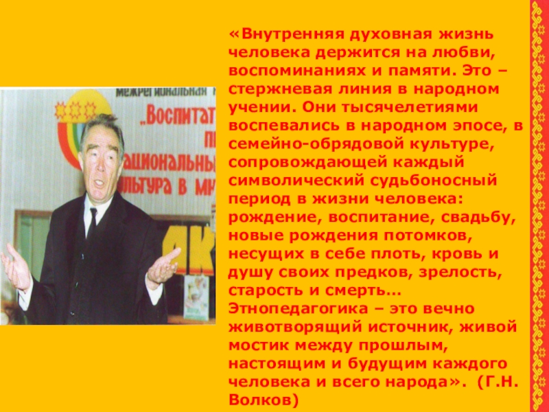 – стержневая линия в народном учении. Они тысячелетиями воспевались в народном эпосе, в семейно-обрядовой культуре, сопровождающей каждый символический судьбоносный период в жизни человека: рождение, воспитание, свадьбу, новые рождения потомков, несущих в себе плоть, кровь и душу своих предков, зрелость, старость и смерть… Этнопедагогика – это вечно животворящий источник, живой мостик между прошлым, настоящим и будущим каждого человека и всего народа». (Г.Н.Волков)