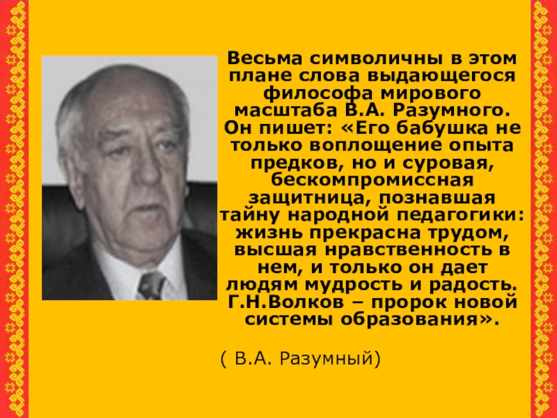 Разумного. Он пишет: «Его бабушка не только воплощение опыта предков, но и суровая, бескомпромиссная защитница, познавшая тайну народной педагогики: жизнь прекрасна трудом, высшая нравственность в нем, и только он дает людям мудрость и радость. Г.Н.Волков – пророк новой системы образования».