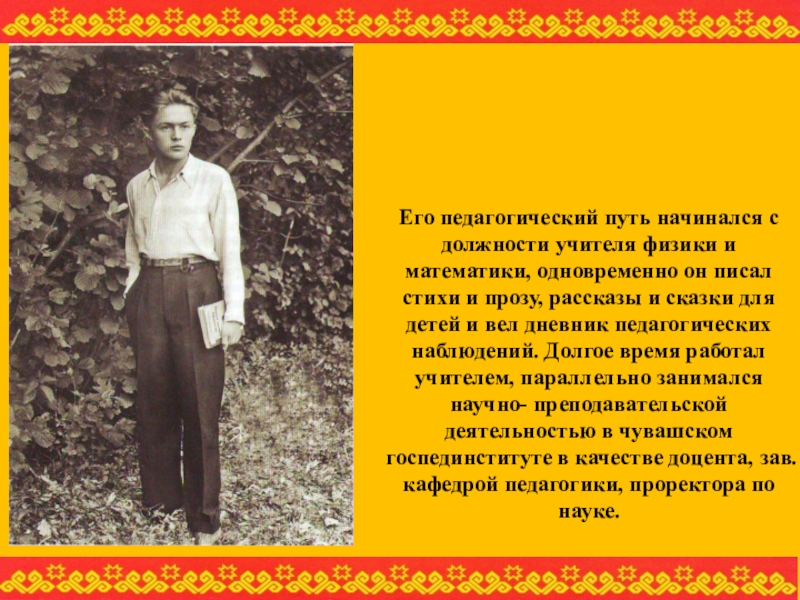 он писал стихи и прозу, рассказы и сказки для детей и вел дневник педагогических наблюдений. Долгое время работал учителем, параллельно занимался научно- преподавательской деятельностью в чувашском госпединституте в качестве доцента, зав. кафедрой педагогики, проректора по науке.