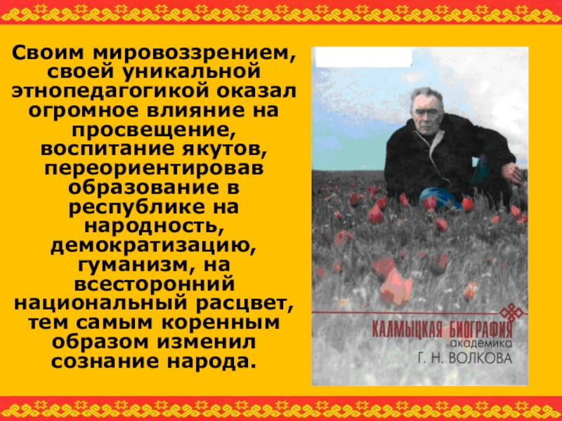 Слайд 13Своим мировоззрением, своей уникальной этнопедагогикой оказал огромное влияние на просвещение, воспитание