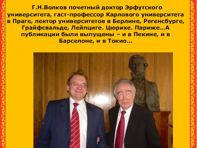 Слайд 19 Г.Н.Волков почетный доктор Эрфутского университета, гаст-профессор Карлового университета в Праге,