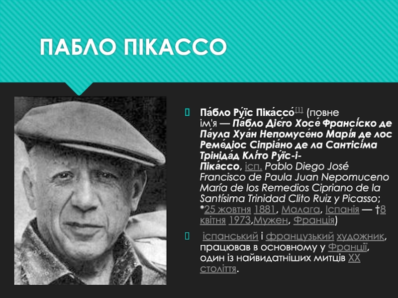 іспанський і французький художник, працював в основному у Франції, один із найвидатніших митців XX століття.