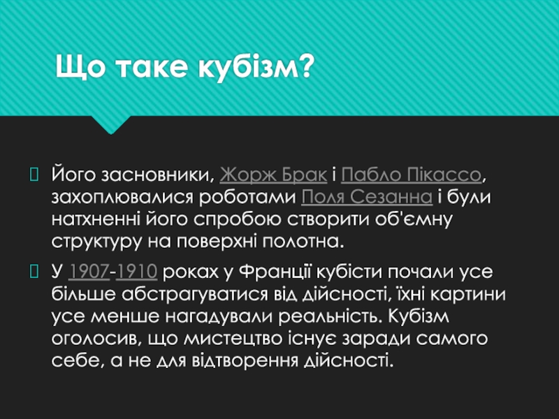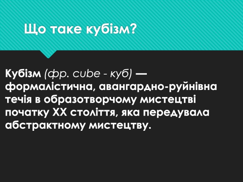 Кубізм (фр. сube - куб) — формалістична, авангардно-руйнівна течія в образотворчому
