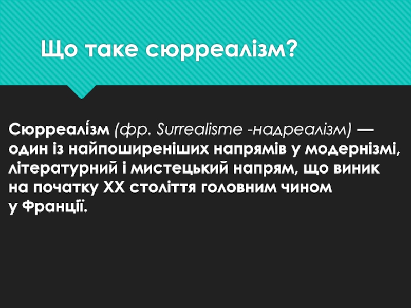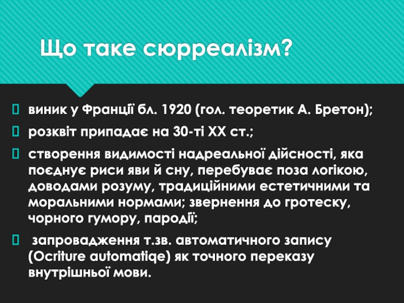 виник у Франції бл. 1920 (гол. теоретик А. Бретон);