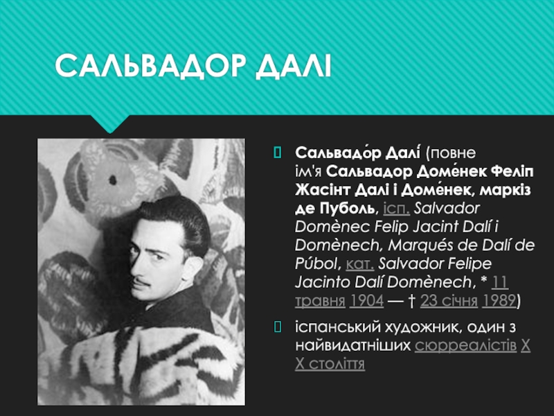 Сальвадо́р Далі́ (повне ім'я Сальвадор Доме́нек Феліп Жасінт Далі і Доме́нек, маркіз
