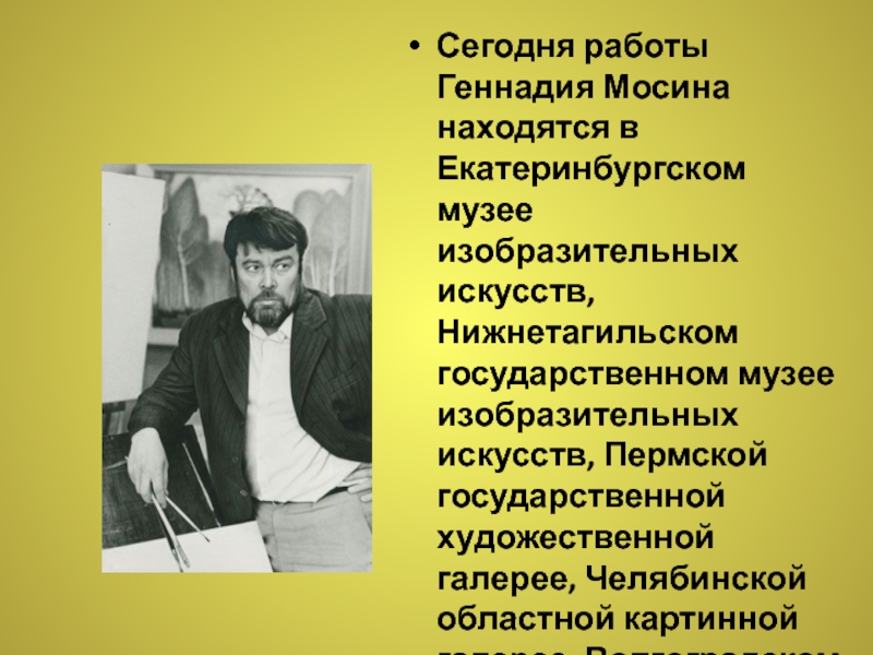 Слайд 25Сегодня работы Геннадия Мосина находятся в Екатеринбургском музее изобразительных искусств, Нижнетагильском