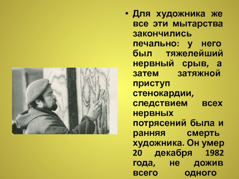 тяжелейший нервный срыв, а затем затяжной приступ стенокардии, следствием всех нервных потрясений была и ранняя смерть художника. Он умер 20 декабря 1982 года, не дожив всего одного месяца до пятидесяти трех лет.